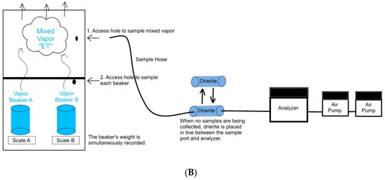 The beaker weights were simultaneously recorded, and these weights were determined with a precision of 0.0001 g. The mass of water that evaporated from each beaker was calculated as each vapor was sampled. A water mass balance approach was used to determine the percent contribution from each beaker to the mixed vapor.