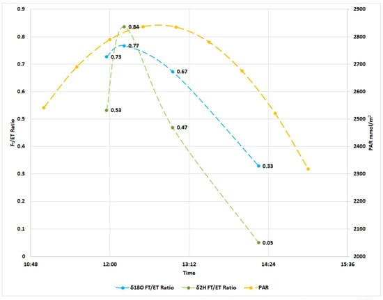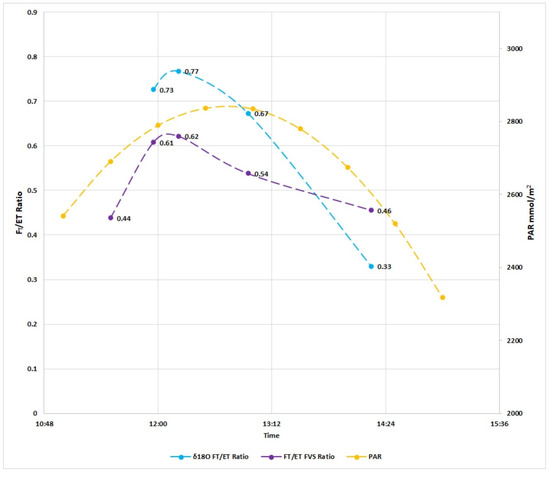 Fluxpart is a program that can be used to apply the FVS method. It is an open-source Python 3 program that can utilize metadata and raw 10 Hz EC data to produce ET and CO2 partitions and fluxes at 15 min intervals. The Big Cypress field site was the same location as that used for the field isotope data collection. Furthermore, 10 Hz high-resolution EC data from the Big Cypress microclimate flux station, measured on the same day as the Isotope observations, were used as the input data to run the Fluxpart program. For related timeframes, a comparison between the FVS and IMB results are presented below, (Figure 6).