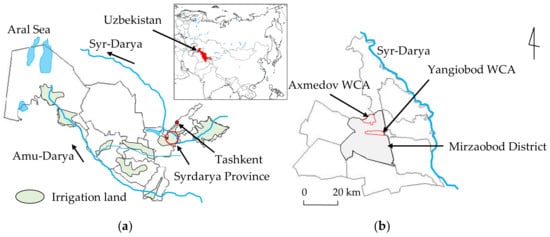 Location maps of the study site: (a) Irrigation land and Syrdarya Province in Republic of Uzbekistan; (b) Axmedov Water Consumers’ Association (WCA) and Yangiobod WCA in Mirzaobod District, Syrdarya Province.
