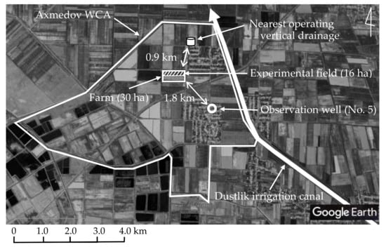 Location of the experimental field in Axmedov WCA. The figure shows the location of the nearest operating vertical drainage, observed well outside of the farm and the main irrigation canal, referred to as Dustlik irrigation canal.