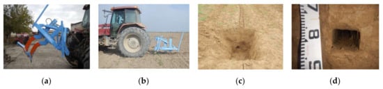 Construction of a cut-drain: (a) Equipped drilling machine; (b) towing the drilling machine; (c) cut-drain in soil profile (depth: 60–90 cm); and (d) constructed cut-drain (width: 10 cm, height: 10 cm).