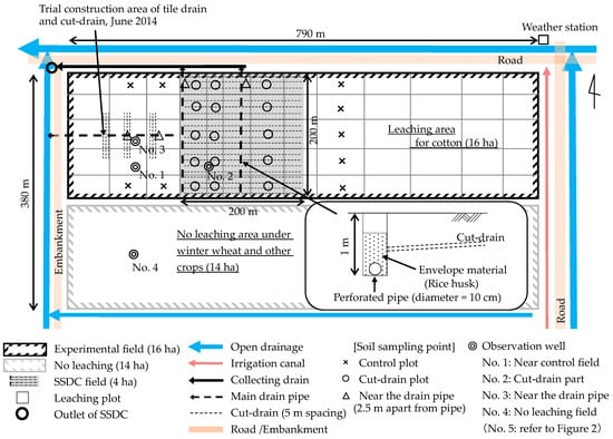The design of the experimental field in this study having an area of 16 ha on the farm is illustrated in Figure 4. Later in the year, the field was used to produce cotton. Before sowing cotton, the experimental field was divided into 65 leaching plots (13 rows in an east-west direction with 5 plots in a north-south direction). The area with the SSDC was 4.0 ha. In the SSDC field, two main tile drains comprised of a perforated pipe and rice husk, were installed in 2015 at a depth of approximately 1.0 m. The diameter and length of the pipe were 10 cm and 200 m, respectively. Using a tractor of 130–140 HP, cut-drains were constructed in 2015 and 2016 to a depth of 60–90 cm with a spacing of 5 m. Since the cut-drain has a risk of preferential flow occurring which causes cavity collapse, we constructed it when the soil was wet along construction lines to mitigate the preferential flow in 2016 []. Cut-drains crossed the main tile drains to connect parts of the rice husk. The length of the cut-drains was 100 m on the east side of the main tile drain. The direction of the cut-drains was parallel to the field gradient from east to west. The area of the control field was set near the SSDC field.