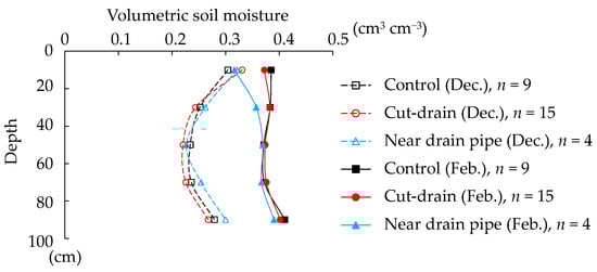 Soil samples were taken before leaching on 19 and 20 December 2016, and after leaching on 27 and 28 February 2017. The volumetric water contents before and after leaching are shown in Figure 5. Soil moisture was horizontally uniform before leaching while those of surface and bottom layers were higher than that of the middle layer. During leaching, all plots were flooded, and at the end of February when 1.5 months from the final day of leaching had passed, moisture levels remained high in almost the entire root zone. The only exception in this case was the surface layer (0–20 cm) near the drain pipe.