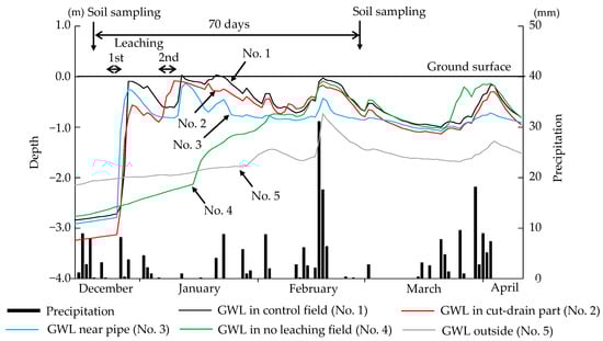 To observe fluctuation of groundwater depth, five observation wells using perforated pipes were installed to the depth of 4.5 m from the ground surface. Using these wells, the GWLs were monitored at each point in the control field (No. 1), the cut-drain part (No. 2), and the area near the drain pipe (No. 3). In addition, to compare the groundwater fluctuation between with and without leaching, two GWLs (No. 4 and No. 5) were also monitored. Point No. 4 was installed at a distance of 70 m from the experimental field in the same farm under winter wheat. No. 5 was installed at a distance of approximately 1.8 km from the experimental field, where there was no field under leaching nearby (Figure 2). The GWLs were observed using water level loggers (Model HOBO-U20-001-04-TI, Onset Computer Corporation, Bourne, MA, USA) put into the wells. A barometer using the same model was also set near the field to calculate the GWL.