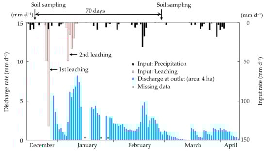 The discharge rate at the outlet is shown in Figure 7, along with leaching water and precipitation. The outlet was closed during the first leaching period to ensure sufficient time to soak the soil with leaching water. Nine hours after completion of water supply in the first leaching, discharge started. The outlet was opened on 30 December after a lapse of sixty hours from the completion of the leaching, and measurement of the discharge rate was commenced. Therefore, discharge rate measured on the first day also included the discharge accumulated from previous two days. Although some data were missing, the total discharge for the 70 days was 149 mm, corresponding to 34% of the applied water.