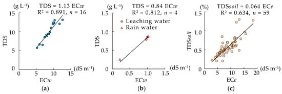 Correlation between electrical conductivity (EC) and total dissolved solid (TDS): (a) ECw and TDS in discharged water from the outlet of SSDC; (b) ECw and TDS in leaching water from canal and rain water; (c) ECe and TDSsoil in sampled soil. Note: The samples for analysis were taken on the same farm, and the days of sampling were (a) in December 2015, January 2016, January and February 2017, (b) in January 2016 and January 2017, and (c) in December 2016 and February 2017.