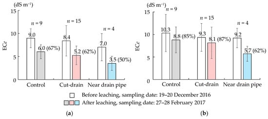 Changes in soil salinity before and after leaching: (a) Upper layer (0–60 cm); (b) lower layer (60–100 cm). Error bars represent the standard deviation. The figure above the bar shows the ECe. The figures between parentheses show the percentage of ECe after leaching to that before leaching. The n represents the number of the sampling points. The analysis of variance resulted in no significant differences (p < 0.05).