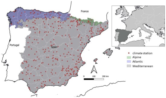 Spain can be subdivided in three main biogeographical regions (Figure 1). Most of the country is classified as Mediterranean, with the exception of the northern coastal region that is Atlantic and the Pyrenees mountain range, which is classified as Alpine []. The Mediterranean biogeographical region corresponds to a temperate climate region (type C), according to the Köppen classification system, and can be further subdivided into hot and warm summer Mediterrean Climate, Csa and Csb, respectively, which are considered typically Mediterranean climate zones, and cool-summer Mediterranean climate, Csc. Some parts of this biogeographical region of Spain are also drier and are also classified as dry climates (type B, specifically hot deserts climate, BWh, cold desert climate, BWk, and hot semi-arid climate, BSh). These are located in the southeast coastal regions of Murcia, Almeria and Valencia and the Ebro valley. The northern Atlantic biogeographical region mostly corresponds to temperate climate (type C) without a dry summer (humid subtropical and oceanic climate, Cfa and Cfb). The Alpine regions correspond to cold climate types without dry season (warm summer continental and subarctic climate, Dfb and Dfc).