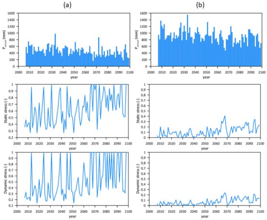 Evolution of precipitation, static stress and dynamic stress between 2006–2100, for a site in southern Spain and northern Spain, respectively: (a) site La Rambla, Córdoba (N 37.606, W −4.741); (b) Lugo, Lugo (N 43.011, W −7.555).
