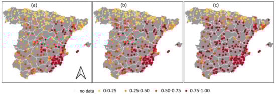 Average value of the dynamic stress indicator in Spain over the periods 2006–2040 (a); 2041–2070 (b); and 2071–2100 (c).