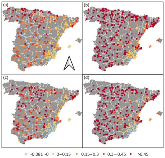 Increase of the static drought stress in Spain over the periods: (a) 2006–2040 vs. 2041–2070 and (b) 2006–2040 vs. and 2071–2100; and increase of the dynamic drought stress over the periods (c) 2006–2040 vs. 2041–2070 and (d) 2006–2040 vs. 2071–2100. Change is indicated as fractional and negative values indicate a drought stress decrease.