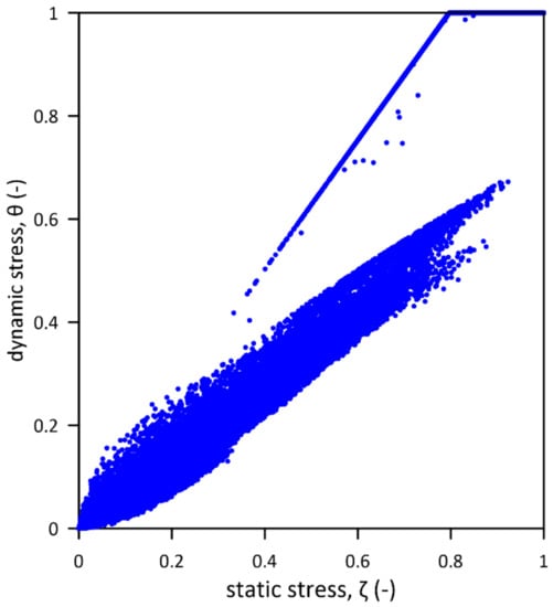 The relation between static and dynamic stress is shown in Figure 7. It can be seen how most points are clustered, except for a few points that are limited by the maximum envelope, as, for static stress values higher than 0.8, dynamic stress reaches the maximum of 1.