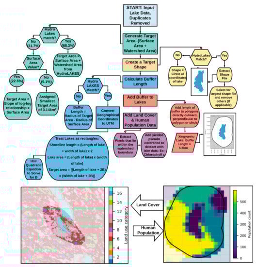 Although land cover and human population are known determinants of chlorophyll concentrations in lakes, we are currently limited by our ability to appropriately quantify the proportion of each land cover category and the number of people within a lake’s watershed. Advances in remote sensing and data availability provide an opportunity to harmonize land cover and human population data from disparate sources [32] in order to develop a broader understanding of the effects for lakes. A novel analytical framework was necessary for the creation of watersheds for lakes where the delineated watershed is not known, particularly for small and remote lakes. This framework allows lakes with known and unknown watersheds to be equally analyzed. Studies to date on the impacts of land cover and human population on primary production have been largely regional, examining the effects of these drivers within a single or few watersheds that have been previously delineated [27,33,34,35]. Using the proposed methodology for generating watersheds, we can analyze globally drivers of chlorophyll in lakes.