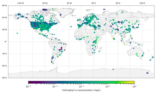 Global distribution of 9313 lakes with measured in situ chlorophyll concentrations. Chlorophyll a concentrations are illustrated by color on a logarithmic scale. Lakes are located in 72 countries across all continents.