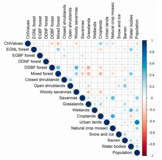 Spearman correlations between chlorophyll concentrations, land cover categories and human population within the pseudo-watersheds of 9313 lakes. Blue circles indicate positive correlations, red circles indicate negative correlations. Absent circles indicates insignificant correlation (p > 0.05). The acronyms are as follows: DDBF = Deciduous Broadleaf, EGBF = Evergreen Broadleaf, DDNF = Deciduous Needleleaf, EGNL= Evergreen Needleleaf.
