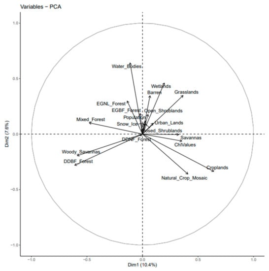 We conducted a Principal Component Analysis (PCA) with function prcomp to assess the strength of the relationship between chlorophyll and the 17 categories of land cover [42]. Principal axes were generated to explain the maximal amount of variation in the data. The PCA algorithm generates principal components (axes) where the data shows the maximum amount of variation [43]. The PCA outputs a two-dimensional ordination plot which visualizes the relationships between predictor variables [43]. A broken stick analysis (Package PCDimension, [44]) and scree plot test were used to identify the three significant axes in the Principal Component Analysis. The PCA was visualized using the R function fviz_pca_var [42].