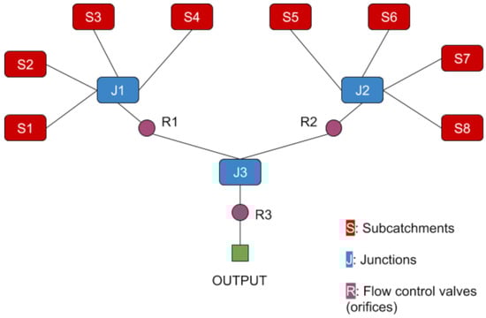 Figure 1—the SWMM model utilized in this research—is based on the designs of previous machine learning implementations by Bowes et al. (2020) []. This model houses eight subcatchments (), three major junctions (), and three flow control valves—orifices—() in this system. The elevation changes are not indicated within the diagram, but are programmed into the model and the system drains downward toward the outfall (). The R valve position can be dynamically controlled in any range of openings between 0% and 100%.