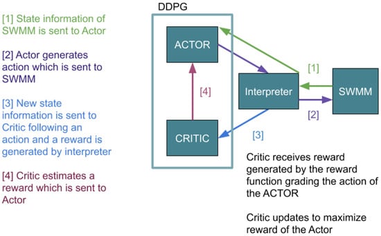 New RL techniques are capable of handling continuous states and actions, a requirement for this project. Deep Deterministic Policy Gradient (DDPG) is an Actor-Critic RL algorithm that combines some of the optimal characteristics of deep Q learning in a continuous action space. Although this algorithm was developed in 2015 and has been tested primarily on games—Atari games are the current industry standard for evaluating reinforcement learning []—DDPG has potential applicability for large, complex systems such as urban infrastructure because of its ability to integrate the continuous and streaming datasets with interactive variables. Interactions between SWMM and DDPG are processed through an interpreter [], converting DDPG output into a context readable by SWMM and vice versa with SWMM output. This interpreter is loosely based around the OpenAI Gym environment [], a standardized framework for RL and environment interaction and RL is implemented with the keras-rl python package []. The python PySWMM wrapper for SWMM allows for the SWMM model to be run incrementally, an essential requirement for RL [].