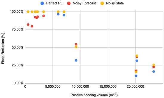 The DDPG implementations, even with added noise, showed reductions in flooding compared to the passive conditions, evaluated on 15 test conditions. The tests show that DDPG learned a policy that reduced total flood volume by an average of 69–73% compared to the passive system and several test events had 100% reductions. The implementations were evaluated using disadvantages more realistic in real-world conditions such as uncertain forecast and state data. Nevertheless, each DDPG implementation performed similarly to the others. This shows the ability to account for and even learn how to use data formerly unused due to unpredictability and uncertainty, such as forecasting.