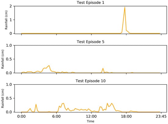 Of the 15 test rainfall events used to evaluate the performance of the RL implementation, three events—1, 5, and 10—were randomly selected as a sample for further analysis. The rain events for testing episodes one, five, and ten are displayed in Figure 5.