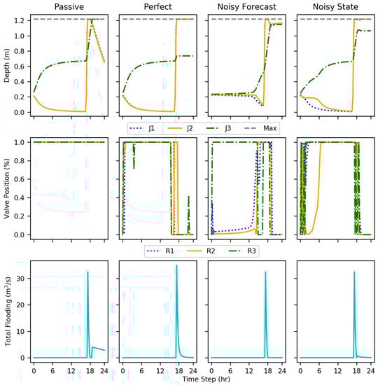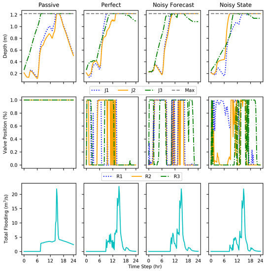For test episode 5 (Figure 7), there was peak rainfall of approximately 0.4 cm of rainfall over a 15 min period, however there was a continuous, yet minor rainfall for 24 h period. While a seemingly small quantity of water, multiplied across the area of eight subcatchments, the perfect implementation was overwhelmed. Similar to the first episode, were well below flood stage; however, flooded. In the case of this episode, flooding occurred for nearly 12 of the 24 h resulting in , the passive performing the worst. The perfect data implementation was able to modulate the valves, resulting in a 96% reduction. Similar to the first test episode, the perfect data implementation caused flooding at and while keeping below flood stage; again distributing the flooding volume to two areas. Both of the noisy data variants performed similarly resulting in a 100% reduction. Each case was able to keep each junction below flood stage.