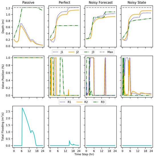 This study was designed to compare the effectiveness of RL policies in reducing flooding volume under the following conditions: (i) perfect state and forecast data, (ii) perfect state and uncertain forecast data, (iii) uncertain state and forecast data. The RL policies were compared to a passive system where all stormwater valves were 100% open.