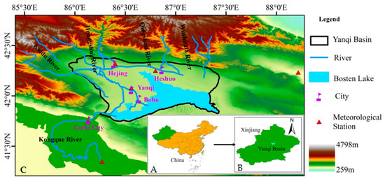 Location map of the Yanqi Basin in China: (A) map of China, (B) map of the Xinjiang region, and (C) schematic of the modeled area. The altitude of the Yanqi Basin ranges from 1050 to 1200 m, and covers six major irrigation areas. The Yanqi Basin does not include upstream regions because there is no agricultural or other productive activity in the upstream areas.