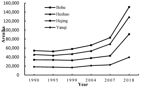 Change of cultivated land area in the study area (study area including the Yanqi County, Hejing County, Heshuo County, and Bohu County).