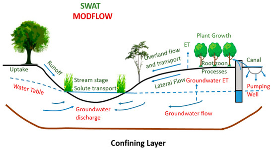Schematic diagram of the integrated surface water and groundwater model, showing components of soil and water assessment tool (SWAT) (green) and modular three-dimensional finite difference groundwater model (MODFLOW) (red) simulations. Modified from Bailey, et al. [31].