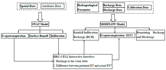 As mentioned above, the SWAT-MODFLOW integration model needs to establish an HRU-CELL interactive interface through ARCGIS; that is, the features of the HRUs in the SWAT model are swapped with those in the MODFLOW model [24]. The principle of groundwater recharge and evaporation counting in SWAT–MODFLOW is shown in Figure 6.