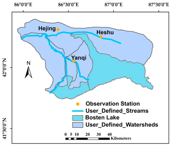 The sub-basin automatically delineated by the DEM data is quite different from the actual situation because the Yanqi Basin is a plain area with considerable human influence. As a result, we defined 6 watersheds according to the division of agricultural irrigation areas in the study area (Figure 5). and 88 HRU were generated on the basis of land cover, soil type and slope characteristics. The average annual runoff of the Kaidu River and the Huangshuigou River is 3640 million m3 and 280 million m3, respectively. Therefore, long-term runoff data is entered into the point source edit field of the SWAT model. The three observation stations in Figure 5 are Hejing, Heshuo and Yanqi. They provided measured data between 1955 and 2017 to use as weather input for SWAT, including daily rainfall, the highest and lowest temperature, data on solar radiation, relative humidity, and data on wind speed.