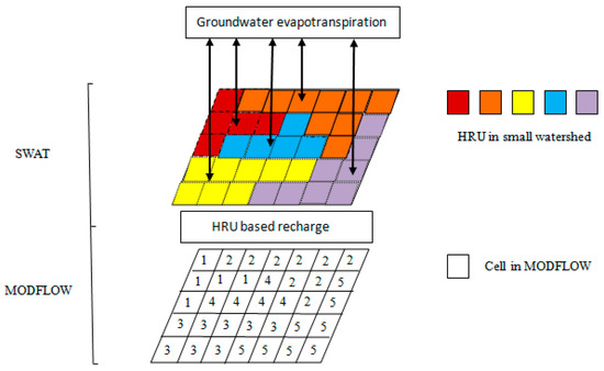 Schematic diagram of the hydrological response unit (HRU)-cell coupling between SWAT and MODFLOW.