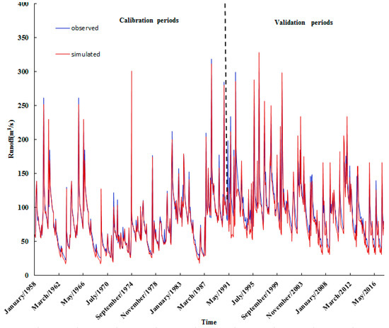 Calibration and validation results for discharge at the Yanqi hydrometric station. The blue and red lines are the observation and the best simulation, respectively.