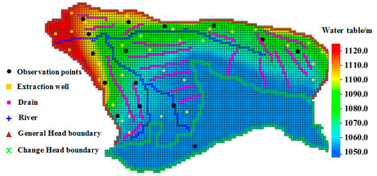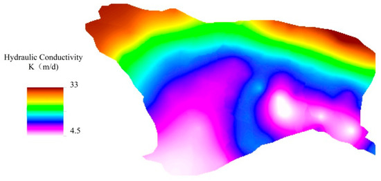 The model was calibrated by combining manual calibration and auto-calibration (PEST pilot points) because of the random nature of the parameter partition in the basin and plain. The final coefficient distribution is shown in Figure 8. “Pest pilot points” is a method of reverse seeking parameters. Pilot points can be regarded as a 2D scatter set. The parameter value in this area is obtained by interpolation from the pilot points. Then the value of the pilot points is calculated by the inverse model. The pilot points’ values are regulated and interpolated to the grid cells until the minimized value of the target function appears. The inversion process is more reliable thanks to the constraint [41].