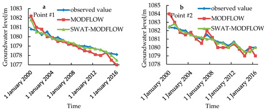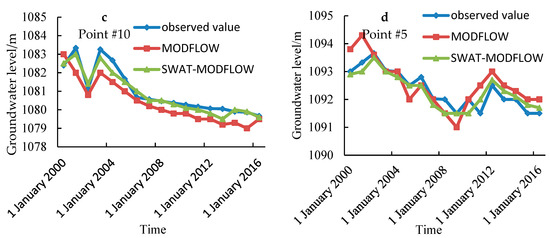 A groundwater model for a medium-sized basin is shown in Figure 9. The southeast region of the model is the Bosten Lake with a high level of phreatophytic plant life. The elevation data of all points, the pumping of the well and the water table of the monitoring well are obtained by field measurements. In the initial year of MODFLOW numerical simulation (2000), the mean groundwater level depth was 4.98 m, the cultivated land area was 16.56 × 104 ha, and the efficient water-saving area (cultivated land that is mainly irrigated with groundwater using efficient water-saving irrigation technology) was 161 hm. The 15 observation wells in the basin and their calibration targets are shown in Figure 10. The distribution of observation wells in the whole basin is uneven, which cannot fully reflect the actual overall seepage field. Therefore, the simulation calibration is based on water level fitting, hydrologic budget fitting and the spatial distribution of the seepage field. The calibration and validation periods for this numerical model are 2000.1–2008.12 and 2009.1–2016.12, respectively, based on the existing actual observation data and the research results of Jiang, et al. [42]. The stress period is divided into 16 and the time step is days. The comparison between the SWAT-MODFLOW integrated model and the separate MODFLOW models of the four representative locations is shown in Figure 10. The simulated groundwater table of the integrated SWAT-MODFLOW model is closer to the measured value than the single MODFLOW model. As shown in Figure 11, good fit between simulated and actual values at 15 groundwater level observation wells, the correlation coefficient between measured and simulated values was greater than 0.95 in the SWAT-MODFLOW integrated model during the regular and verification periods.