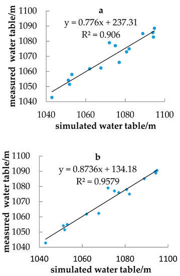 Regression analysis of simulated and measured annual mean groundwater level in MODFLOW (a) and SWAT-MODFLOW (b) models, respectively.
