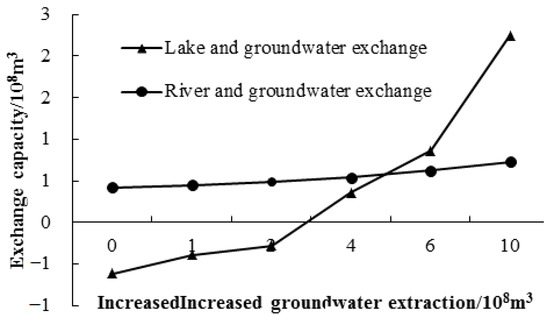 Due to the large amount of reclaimed land in the basin, the increase of irrigation area leads to a rise of the corresponding water diversion, resulting in the change of water level in Bosten Lake. The pressure on water resources may be deduced from the decreasing area and Bosten Lake level. The highest water table of Bosten Lake reached 1049.39 m in 2002 and dropped to 1045.06 m in 2013. Even though the Kaidu River has been in a rainy period in recent years, Bosten Lake still cannot return to its original water level. The main reasons are large-scale land development and diversion and uncontrolled agricultural irrigation. According to statistics, the irrigated area increased from 6700 ha in the 1950s to 19.09 × 104 ha in 2013. The diversion of water in the agricultural irrigation area has reached more than 30% of the natural river inflow, which leads to the decrease of the runoff of the river, the decrease of the water level of the lake and a shrinking of the lake area. Subsequently, the water level of Lake Bosten has continued to rise since 2013, and it has gradually increased to 1047.24 m in 2016. This is mainly because on 12 December 2012, the State Council of China issued a strict water resources management system, which aimed to solve the problem of water shortage, serious water pollution and the worsening of the water ecological environment; it strictly controls the total amount of water used, comprehensively improves the efficiency of water use, and strictly controls the total amount of sewage discharged into rivers and lakes. The declining groundwater level trends observed at the observation-wells are also proof of heavy stress on the water resources within the basin, which also impacts interacting wetlands. The dynamics of the exchange of lakes and rivers with groundwater are shown in Figure 12. The slope of the lake groundwater exchange curve is steeper, which indicates that the lake groundwater exchange is more intense. Moreover, the amount of water entering the underground aquifer of the lake wetland gradually increases with the continuous increase of groundwater extraction. When the increased amount is 10 × 108 m3, the amount of water resupplying groundwater from the lake is 2.25 × 108 m3, accounting for 13.43% of the total extraction amount. The water level of Bosten Lake decreased from 1047.2 m to 1045.9 m with the increase of extraction to 10 × 108 m3. This means that the lake area and water level will be greatly reduced as groundwater continues to be extracted in the future.