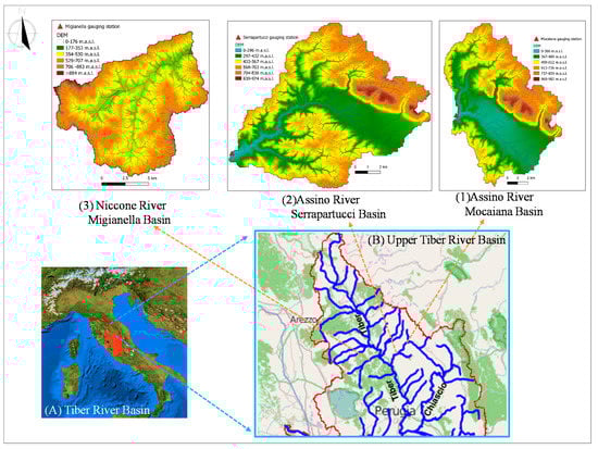 Map of the Tiber River Basin (A) and Upper Tiber River Basin (B) with the location of case study basins.