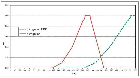 For this reason, in both methods of calculation, a standard abstraction curve for irrigation was used, which applied to the maximum water flow allowed. The irrigation water abstraction was calculated as Qirr = α·Qmax, where daily values of the parameter α are shown in Figure 2 (red line). In the case of FDC (green line), the maximum abstraction was located at the end of the curve, in accordance with the hypothesis that the maximum abstraction occurs during the peak of a drought period, where the duration, or the percentage of time when a specific flow is equal or exceeded, is more than 350 days.