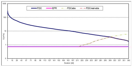 Figure 3 shows the overlap of the FDC with the FDC of the irrigation abstractions (FDCabs), according to the green line of Figure 2, with the constraint of the environmental flow requirement (EFR). When the FDCabs is above FDC, the total irrigation abstractions are no longer possible. The result is the FDC of the real irrigation abstractions (FDCreal-abs). The hypotheses of Figure 2 (green line) and of a constant EFR are certainly burdensome, in terms of water abstractions; however, they are suitable to describe the most critical situations in terms of water scarcity.