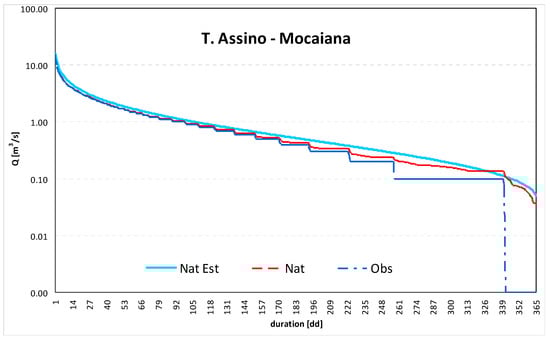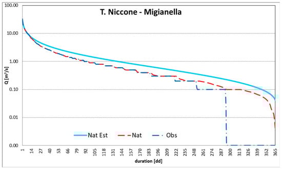 Average FDCs in the Migianella basin. Estimated natural FDC (Nat Est), natural FDC (Nat), and observed FDC (Obs).