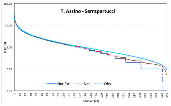 In particular, to carry out a comparison between the methodology suggested by the European Commission and the proposed one with the duration curves, the case study basins described in Table 1 were chosen. The climate of the case study basins is characterized as a Mediterranean climate, with precipitation occurring mostly from autumn to spring seasons. Based on data in the observed period, the mean annual rainfall was in the range of 860–940 mm. All these basins are gauged basins, where the average daily discharge is 0.677–0.910 m3 s−1 with a minimum value of 0.077–0.148 m3 s−1 during drought periods, and they are characterized by a low base flow (Base Flow Index (BFI) ≤ 50 [45,46]), according to the geological characteristics of the Upper Tiber River Basin, where low-permeability formations (flysch sandstone clay, clay and sandstone, and limestone clay) predominate [47]. These characteristics make water resource management in these basins quite difficult, especially during the dry season, when an increase of irrigation water consumption occurs [48] and the balance between environmental and socioeconomic aspects becomes very difficult.