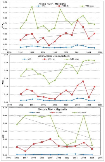 The annual variability of WEI+max, as well as WEI+irr, was due to the variability of the annual climate characteristics during the peak month and the irrigation period, which influenced the annual renewable water resources in Equation (1). The Mocaiana and Serrapartucci hydrometric station were located in the same Assino basin and showed similar variability and trends. Migianella station is located in a different basin, on the other side of the Upper Tiber River Basin, where irrigation water use variability is more accentuated and, consequently, showed a higher WEI+max variability. However, in all the studied basins, due either to maximum values or to trend, a reduction in the difference between the EC method and simplified methodology values was observed.