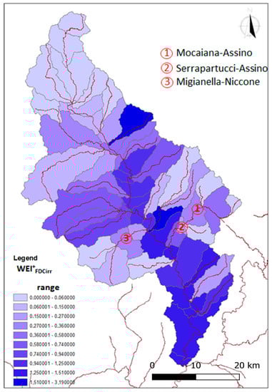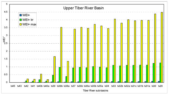 These latter considerations underline how the simplified method is suitable for highlighting seasonal or monthly situations of maximum stress in terms of water abstractions in the basin. Nonetheless, another important aspect is that the simplified methodology proposed in this work allows for regionalization of the calculation of the WEI+ at a very detailed sub-basin level. The use of WEB-GIS for water abstractions and regionalization techniques for natural FDC allows for the rapid calculation of the WEI+ in many sub-basins. In Figure 8, the WEI+ values for the Upper Tiber River sub-basins are represented, while Figure 9 displays the map of WEI+irr in all of the Upper Tiber River basin. It is possible to observe that there are many sub-basins with very high WEI+irr values, especially in the downstream basins. If we consider the average value in the portion of the Upper Tiber River basin to which the regionalization was applied (2187 km2), we obtain WEI+irr = 74.65%. However, the most important result that Figure 8 shows is the value of WEI+max (peak month), with the majority of the sub-basins having values over 1 (WEI+ > 100%). According to the definition of the WEI+, this result can be seen as indicating a very unsustainable scenario, even for a short period of time.
