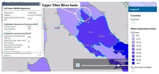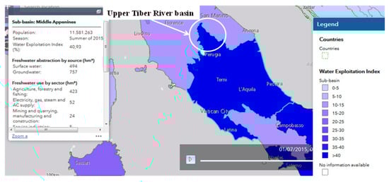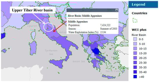 The Upper Tiber River Basin is located in the Middle Appenines district, and the WEI+ data were initially verified in the summer of 2003, which was a very dry period. The WEI+ in this district was 15.94% in the first version (Figure 10) and 32.37% in the second version (Figure 11). A second check was carried out in summer 2015, the last data available, with the value increasing up to 40.93% (Figure 12). This considerable increase was not due to a time factor but rather due to the availability of increasingly updated data; in particular, with regard to water abstractions. This confirms a deep lack of information and data in the first and second elaborations and consequently highlights the importance of developing and improving water abstraction management tools throughout the district, as described in Section 2.2 for the Tiber River Basin.