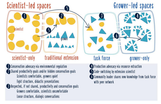 We recognize that there are inherent biases to our participant observation based on our degree of engagement, biases, and cultural identities. In this case the primary participant observer engages in code-switching behaviors in grower spaces, thus was uniquely poised to identify and diagnose code-switching (or lack thereof) by other scientists. An additional limitation inherent in this work is the lack of participant-observation in grower-only spaces. Though we feel confident in our classification of task force members as community leaders, we infer the flow of knowledge from community leaders to other growers based on previous findings highlighting peer-to-peer networks and experiential learning as key drivers of knowledge exchange in agricultural communities [80,81]. We also emphasize that knowledge co-production does not create failure-resistant governance efforts and should not be depoliticized [82], especially when engaging with financially and politically powerful agricultural trade associations. Rather, the findings of this study should be used to build effective co-production spaces and meetings, train future scientists, and reevaluate traditional extension practices.