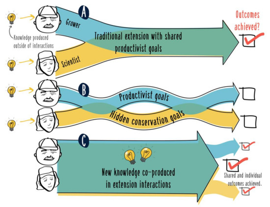 Knowledge exchange and production scenarios for growers and scientists (original artwork). Light bulbs indicate new knowledge production related to goals. Scenario (A) illustrates knowledge exchange when growers and scientists share productivist goals. Scenario (B) illustrates knowledge exchange when scientists have hidden conservation goals. Scenario (C) illustrates knowledge co-production when growers and scientists have differing goals, but engage in repeated interactions brokered by trade associations.