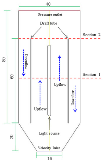 A flow through that continuously operated the airlift photoreactor was used to evaluate the CFD results experimentally. A simple two-dimensional geometry used for the internal airlift circulating photoreactor is shown in