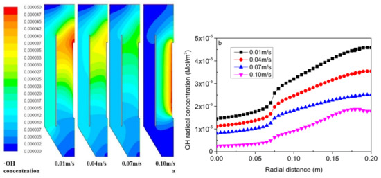 19]. A no-slip boundary condition was imposed on the walls. In addition, the zero diffusive flux of species was specified at the walls. As per the radiation field boundary conditions, the lamp radiation was defined as a zero-thickness semitransparent wall and no-reflecting walls.