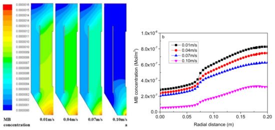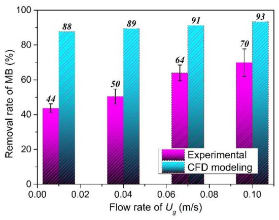 2 was injected from the bottom of the reactor at a rate of 0.3 m/s continuously. At the same time, the air was injected at flow velocity of 0.01, 0.04, 0.07, and 0.10 m/s, respectively. The reactor reached a stable condition after 120 min, then a total of six samples were taken at 30 min time intervals for MB determination. In addition, in order to further analyze the data of various physical elements in the reactor, the data used in this study are Section 1 in the middle of the reactor and Section 2 at the outlet of the reactor shown in